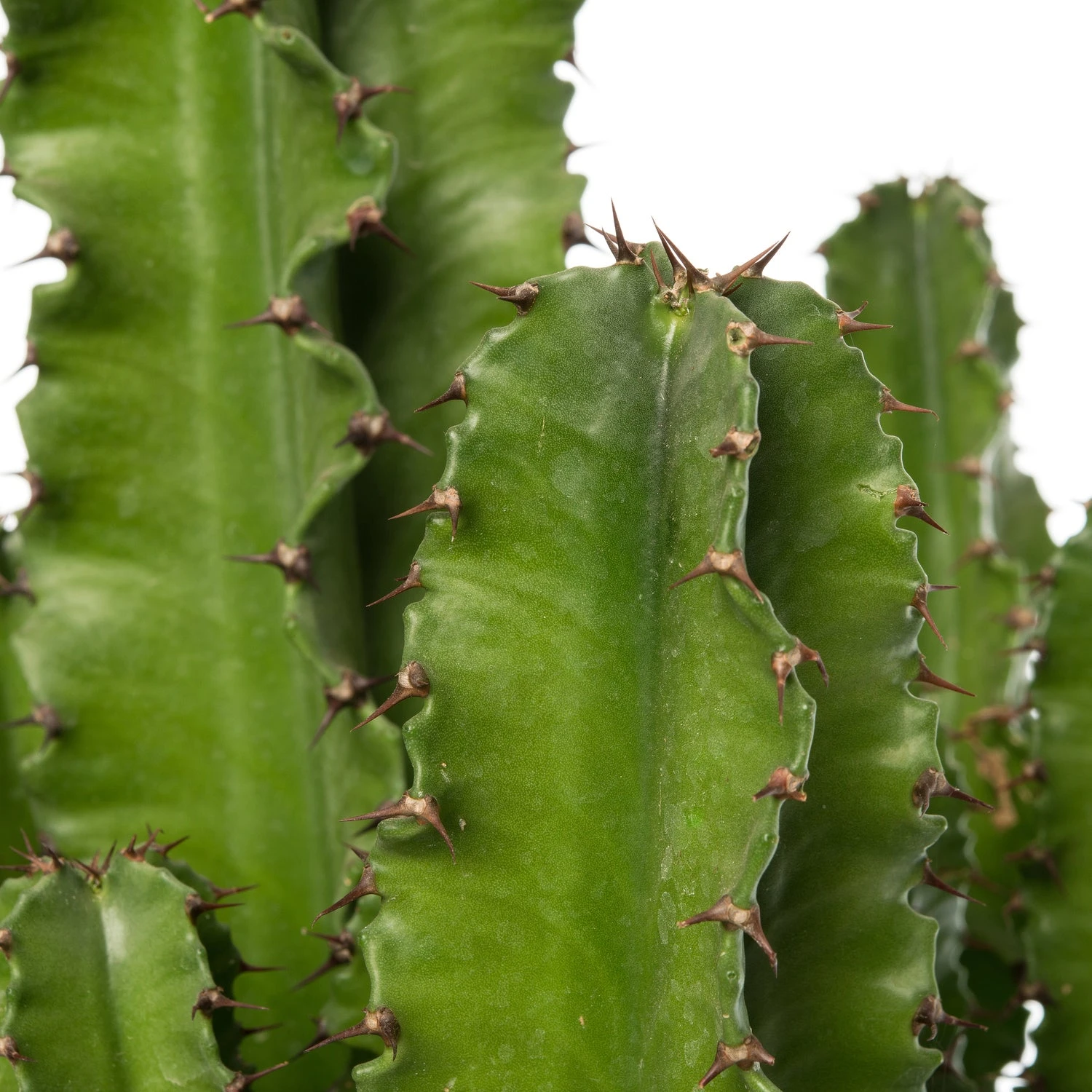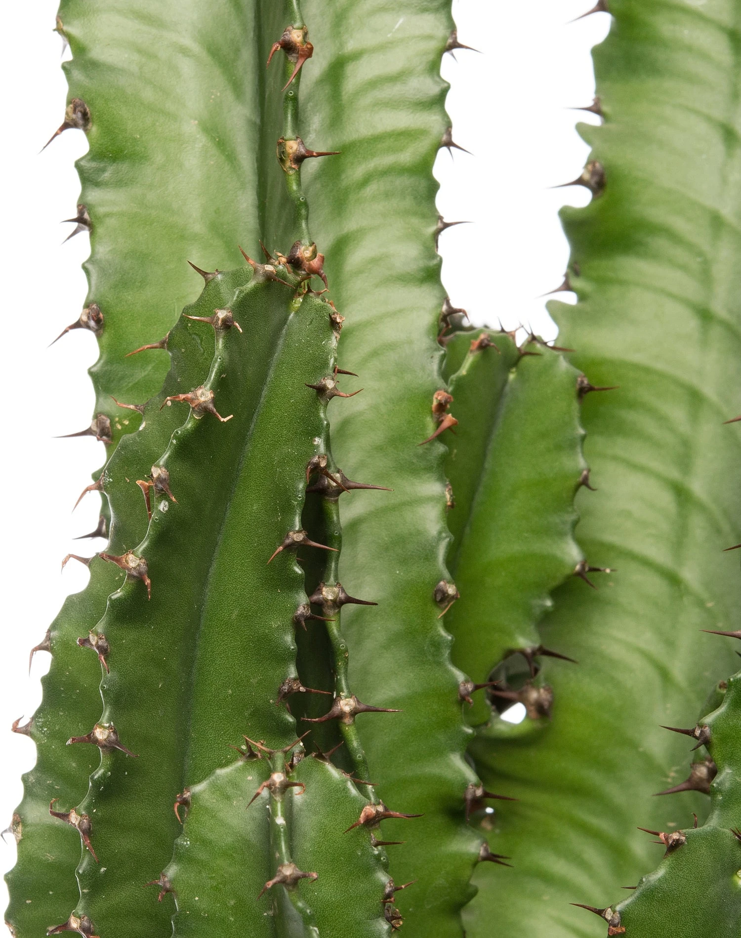 Ze slaan water op in hun stam voor droge tijden. De Euphorbia ingens heeft wit melkachtig vocht, dit vocht is irriterend bij aanraking. Zijn doornen groeien rechtstreeks uit het blad, bij cactussen groeien doornen op een bladkussen of kussenvormig knobbeltje. Deze Cowboycactus is een stoere en makkelijke plant.