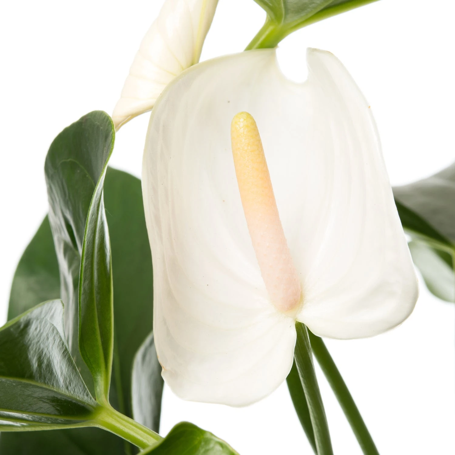 Je herkent hem aan zijn mooie gekleurde schutbladeren die eruit zien alsof ze voorzien zijn van een laklaag. Ook de groene bladeren hebben een wat glimmend uiterlijk. De Anthurium andreanum ‘White Winner’ heeft donkergroene bladeren en zuiverwitte schutbladeren die mooi van vorm zijn.