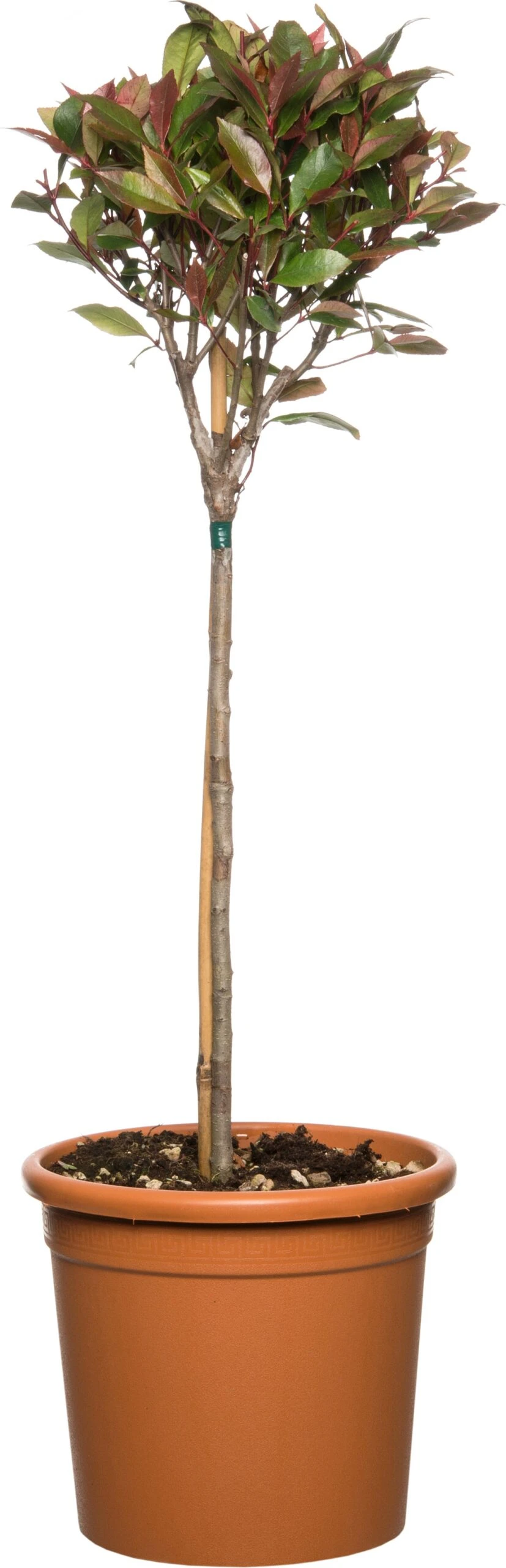 Vanwege zijn mooie rood gekleurde blad is het een graag geziene heester. De Photinia x fraseria ‘Red Robin’ heeft het gehele jaar door blad, in de zomer en winter is het voornamelijk groen. In het voorjaar krijgt hij jonge rode bladeren die langzaam naar groen verkleuren. Deze soort is een cultivar afkomstig uit Nieuw-Zeeland. Gekweekt op stam is het een ideale heester om te planten als solitair in de volle grond of in een pot op het terras of balkon. Zorg voor een voedingsrijke bodem die goed waterdoorlatend is. Het liefst staat hij op een zonnige plek. Als je hem op een plek staat waar hij vol in de wind staat wil hij in de winter graag wat bescherming. Snoeien van deze knappe jongen is niet nodig, maar vind je hem te groot worden of uit model raken? Snoei hem dan in de lente.